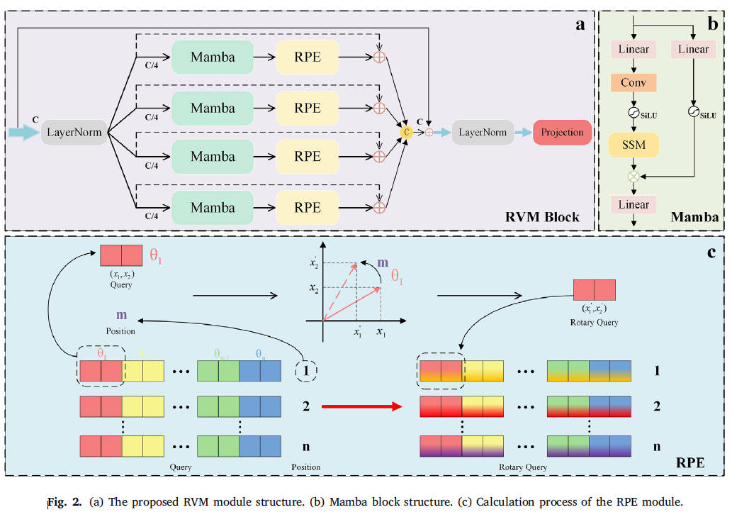 - RVM 模块:采用并行 Mamba 处理输入(通道数降至 1/4),并引入旋转位置编码(RPE),有效弥补标准 Vision Mamba 局部细节捕捉不足的问题,同时保持全局长程依赖建模能力。