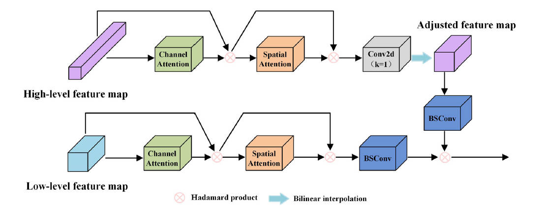 CSF 负责多尺度特征融合。输入高维与低维特征分别经过通道注意力(CA)+空间注意力(SA)生成注意力图,再经 1\times1 卷积+双线性插值对齐尺寸,最后通过 BSConv 进行核内相关性增强的融合: